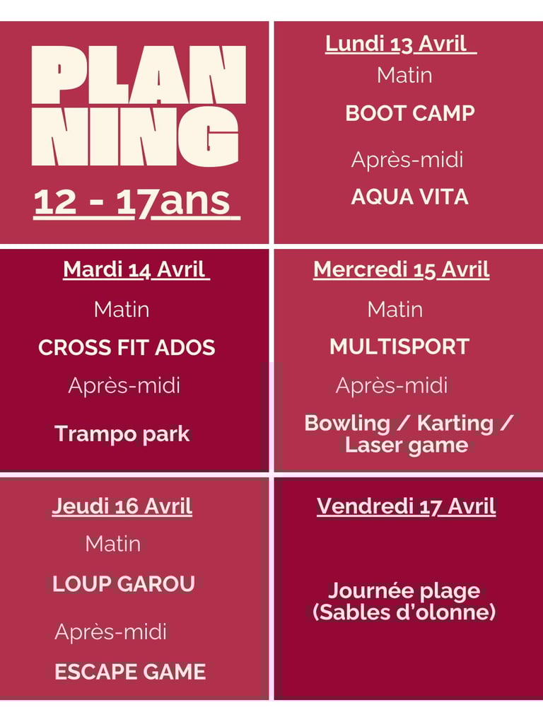 Chaque vacances scolaires nous vous proposons des stages ludiques et sportifs du Lundi au mercredi de 8h à 18h !